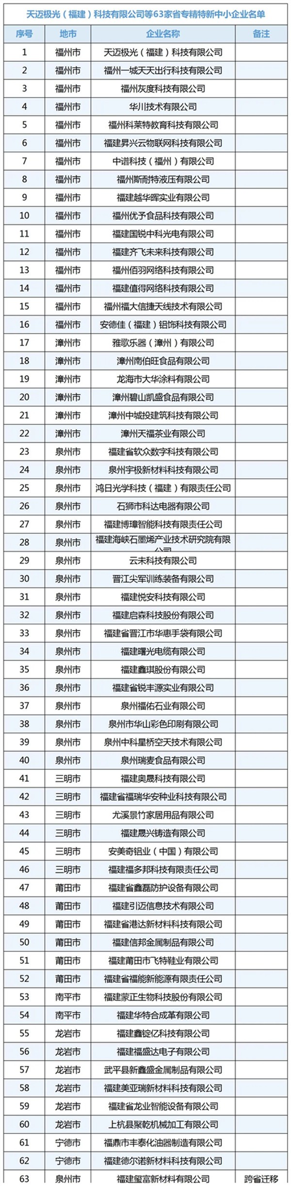 根据《福建省优质中小企业梯度培育管理实施细则》等有关规定,经研究,确定天迈极光(福建)科技有限公司等63家企业为福建省专精特新中小企业,现予公布。