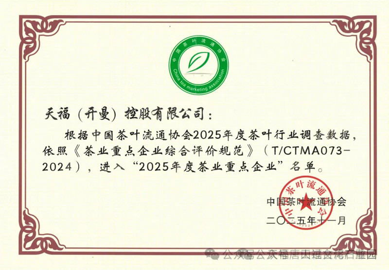会上发布了中国茶叶流通协会2025年度茶叶行业调查结果,并颁发了相关奖项。天福集团(天福开曼控股有限公司)被授予“2025年度茶业综合影响力骨干企业”及“2025年茶业重点企业”荣誉称号。