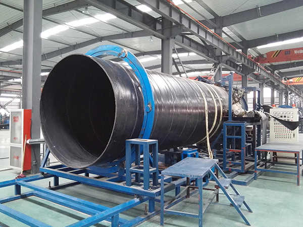 中等口径的中低压管道可由两层膜片同向螺旋缠绕热合而成,中间夹一层镀铜“过塑”高强度碳素弹簧钢丝,其拉伸强度可达1800MPa~2000MPa。每层膜片都先在特种设备上复合一薄层高强度粘合材料。复合管材时外层膜片的中线紧压在内层膜片的接缝上。内层膜片接缝在复合时先用焊枪焊接,外层膜片接缝则采用搭接方式连接。两层膜片敷胶面相向,连同钢丝大面积螺旋缠绕热压粘合,其粘合强度远超普通聚乙烯钢丝缠绕复合管。大口径管道则由3~4层膜片加钢丝复合。管材结构详见图3。
