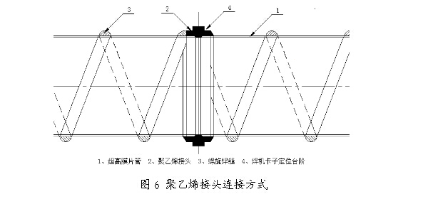 将要连接的两根管材接头打磨出45°斜口,对正后用聚乙烯塑料焊枪沿V型槽焊接一周,待焊接材料冷却后打磨平整。取宽度为管道壁厚10倍以上、表面已覆粘合材料的带状超高膜片作为焊接基材,用超高膜片焊接机沿接缝加热、加压、缠绕焊接多圈超高膜片带。焊接膜片的总厚度不小于管道壁厚,使该连接处强度大于管体本身。再将膜片带两侧与管材外结合处用聚乙烯焊枪焊接起来。然后把大口径管材内部接缝再用聚乙烯焊枪焊接一遍。连接方法如图5所示。